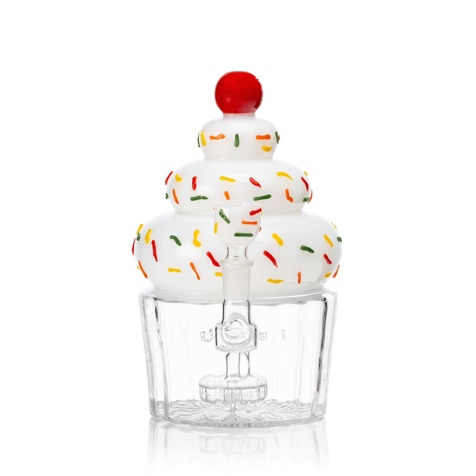 Its standout design includes a white glass frosting top with colorful sprinkles and a scalloped cupcake base. A matching bowl completes this playful yet elegant XL bong, making it a delightful addition to any collection.